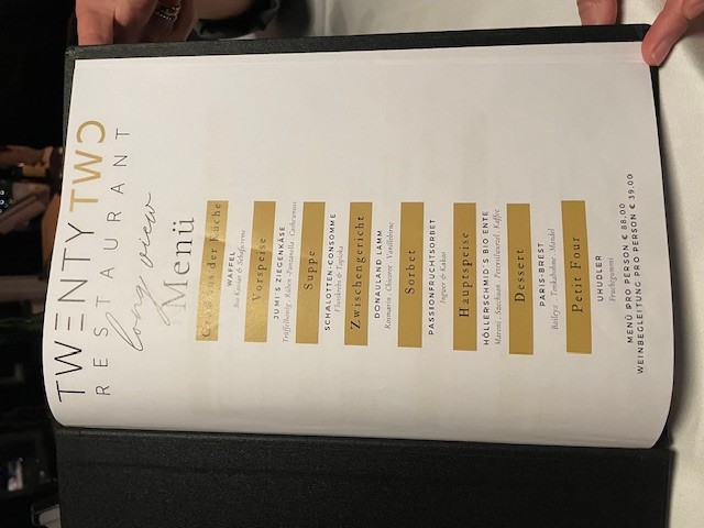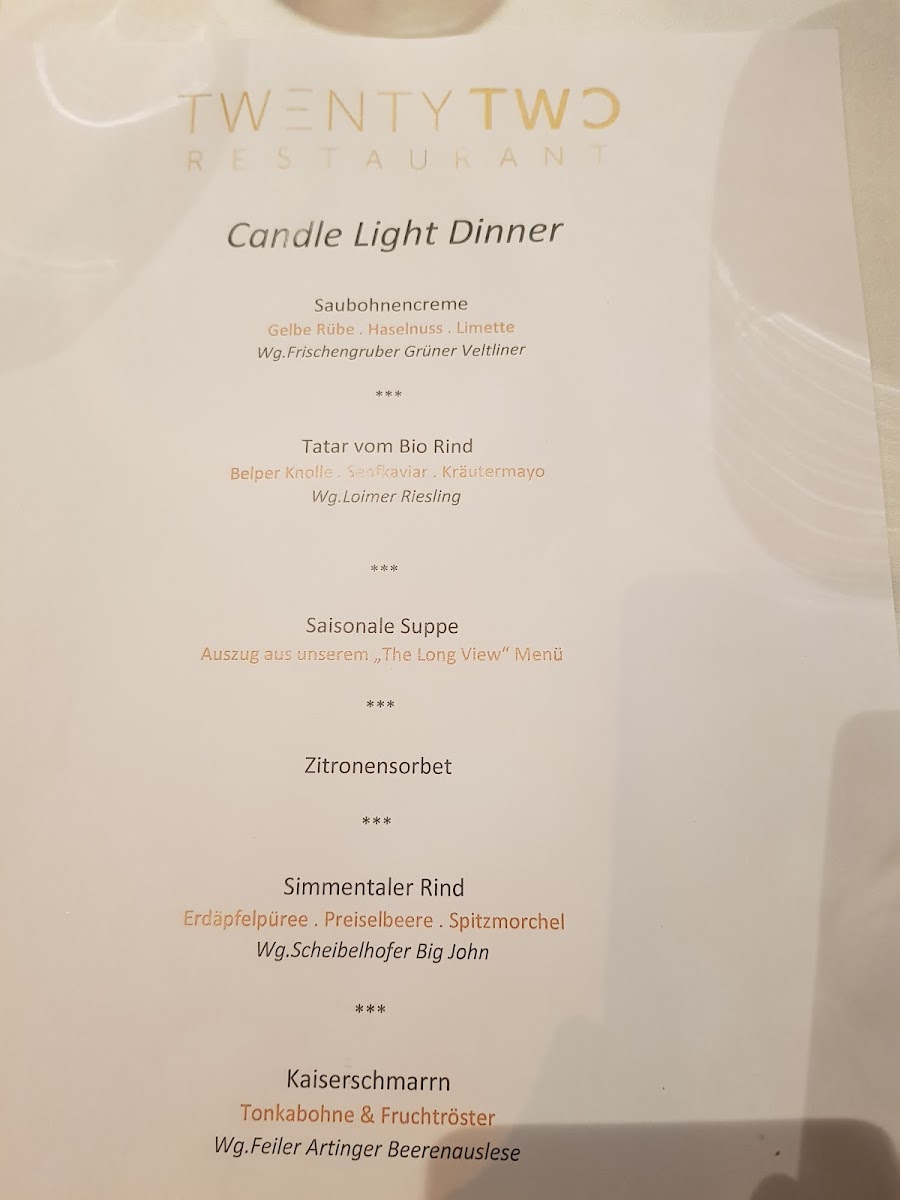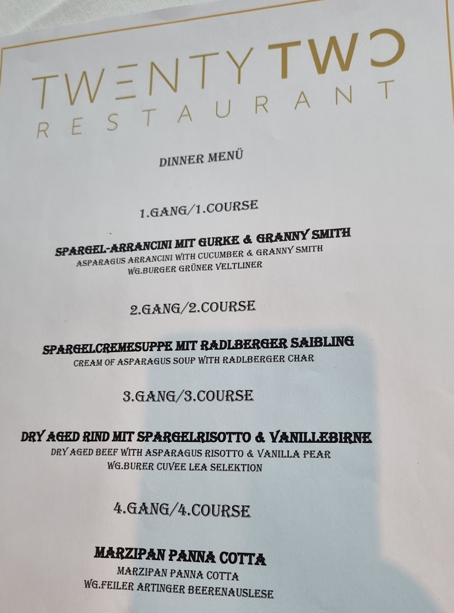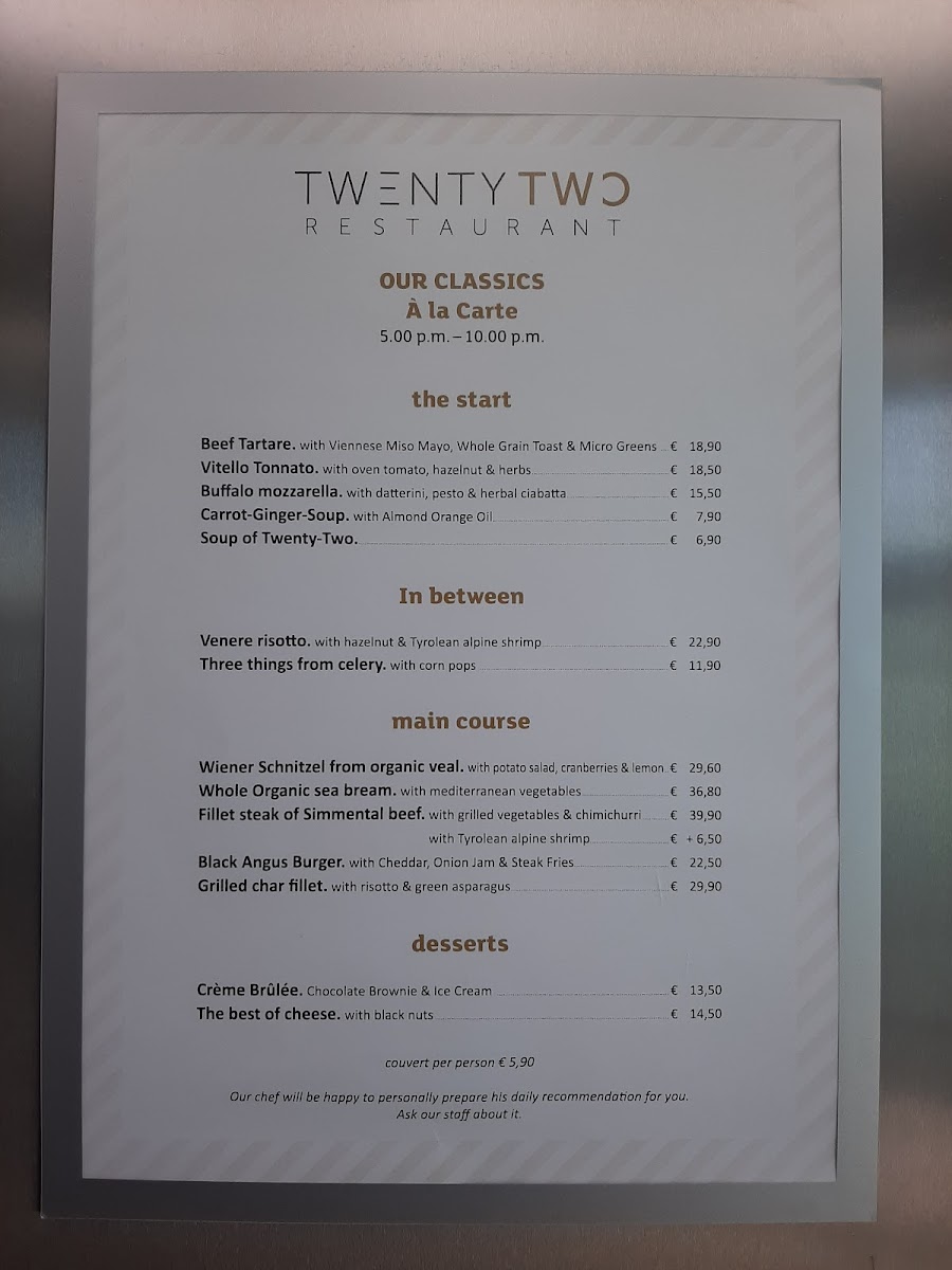 The menu at Twentytwo Restaurant feels thoughtfully curated, balancing refined European technique with light international touches, and it comes together as a cohesive dining story rather than a scattered list of dishes. The Cocktails set a confident tone, clean and well-composed, leading naturally into starters such as Tatar Vom Bio Rind, which stands out for its purity and focus on high-quality organic beef. Seafood elements like Gebeizter Seelachs and Goldbrasse add freshness and precision, while lighter accompaniments such as Labneh, Bulgur Mit Serano, and Saubohnencreme bring subtle Mediterranean and Middle Eastern accents that keep the menu vibrant and modern. For guests seeking classic indulgence, the kitchen delivers confidently with Pan-fried Viennese Veal Schnitzel, a respectful nod to Austrian tradition, and premium cuts like Steak and Chateau Briand, which underline the restaurant’s strength in meat preparation. Japanese-inspired Maki provides a contrasting texture and flavor profile, adding variety without feeling out of place. Vegetarian-friendly options such as Rote-rüben-knödel show care and creativity, proving the menu is not limited to protein-centric thinking. Desserts are handled with the same attention to balance and finesse: Zitronensorbet refreshes the palate, while Cremeschnitte and Topfenknödel Mit Nougat offer comforting sweetness with elegant execution. For those looking for a more structured finale, 4 Gang Erdbeersorbet works as a playful, multi-step dessert experience that leaves a lasting impression. Even earlier in the day, the Etagenfrühstück reflects the same philosophy, combining variety, quality ingredients, and visual appeal into a satisfying start. Overall, the menu communicates confidence, versatility, and a clear identity, making each dish feel like a deliberate part of a well-rounded culinary concept.